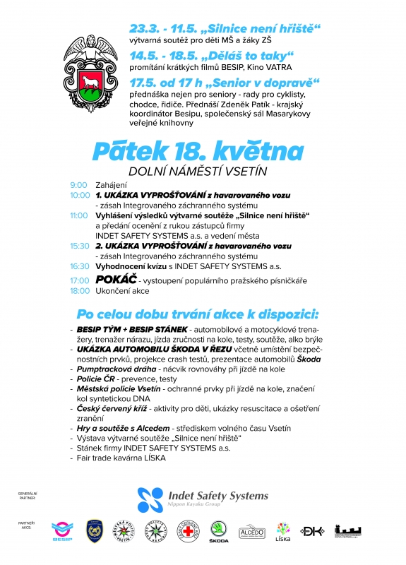 Město Vsetín společně s firmou INDET SAFETY SYSTEMS a.s., BESIPEM a dalšími partnery připravilo pro občany Dny bezpečnosti na Vsetíně. Jejich součástí byla výtvarná soutěž pro základní a mateřské školy Silnice není hřiště, přednáška v knihovně na téma Senior v dopravě, promítání krátkých spotů „Děláš to taky“ před hlavními projekcemi v kině Vatra a především stěžejní akce Den bezpečnosti, která v pátek 18. května nabídla na Dolním náměstí nabytý celodenní program.