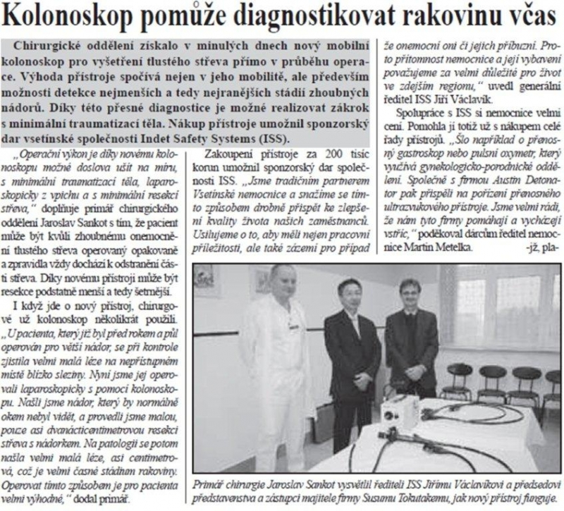 In November 2011 the surgical department in Vsetin hospital acquired a new mobile colonoscope to examine the colon during surgery. The advantage of this device lies not only in its mobility but especially in the detection of the smallest – i.e. the earliest stages of cancer. Thanks to this accurate diagnostics it is possible to complete the procedure with minimum trauma to the body. The device was purchased thanks to a gift from a Vsetín company Indet Safety Systems (ISS).