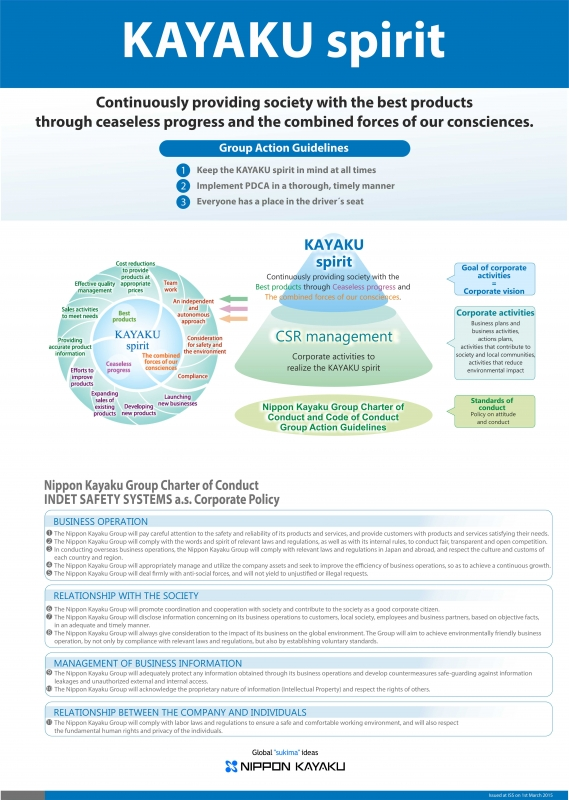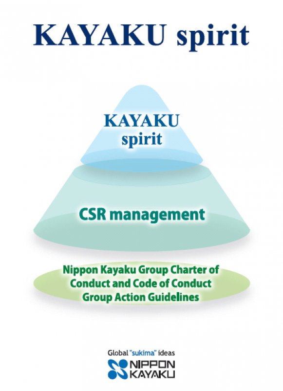 In June 2007, the Nippon Kayaku Group set out the KAYAKU spirit, expressed as "Continuously providing society with the best products through ceaseless progress and the combined forces of our consciences."